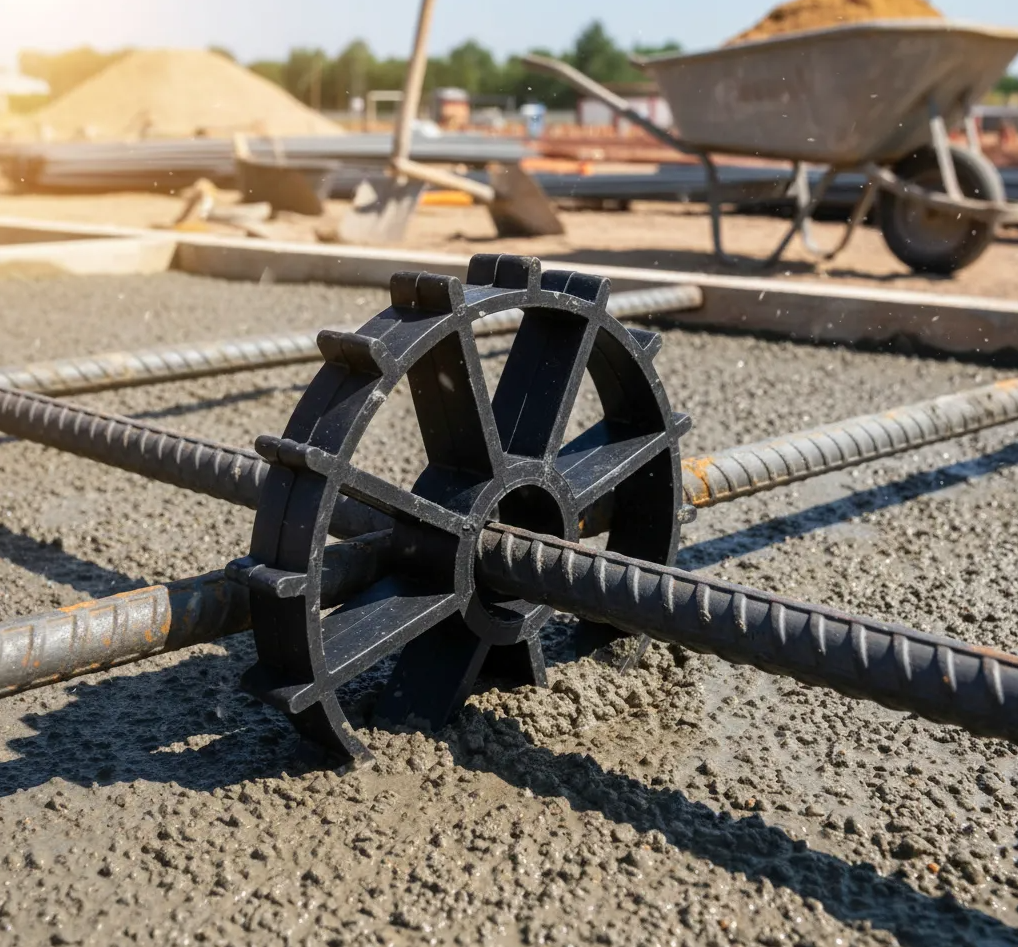 Fabricado en plástico de alta resistencia, el separador rueda es liviano, durable y fácil de instalar, adaptándose a distintas condiciones de obra y diámetros de barra.